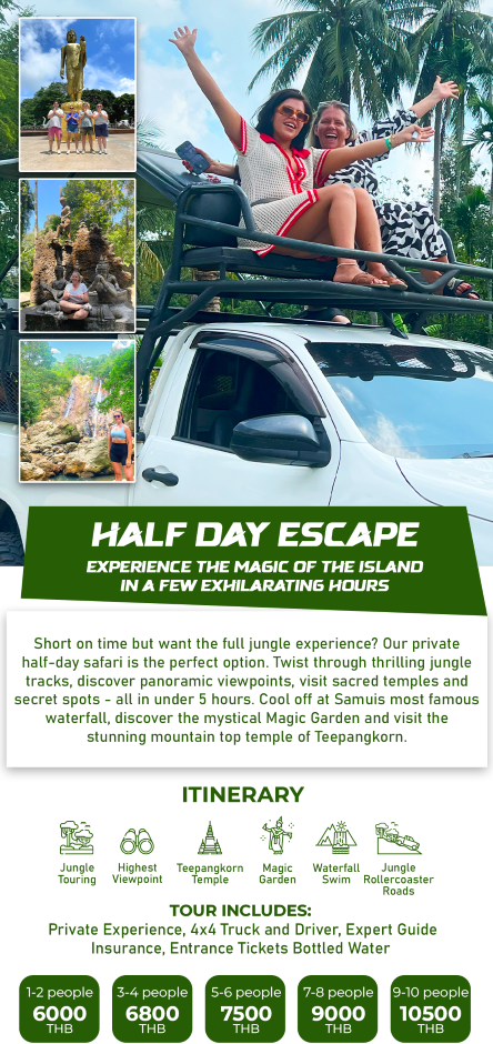 They say the best parts of Samui can’t be found on a map, at Jungle 4×4 Safari, we drive you straight through them. Climb aboard your safari truck and venture deep into islands’ untamed beauty, where winding jungle trails lead to hidden temples, remote waterfalls, and secret beaches you won’t find in any guidebook.