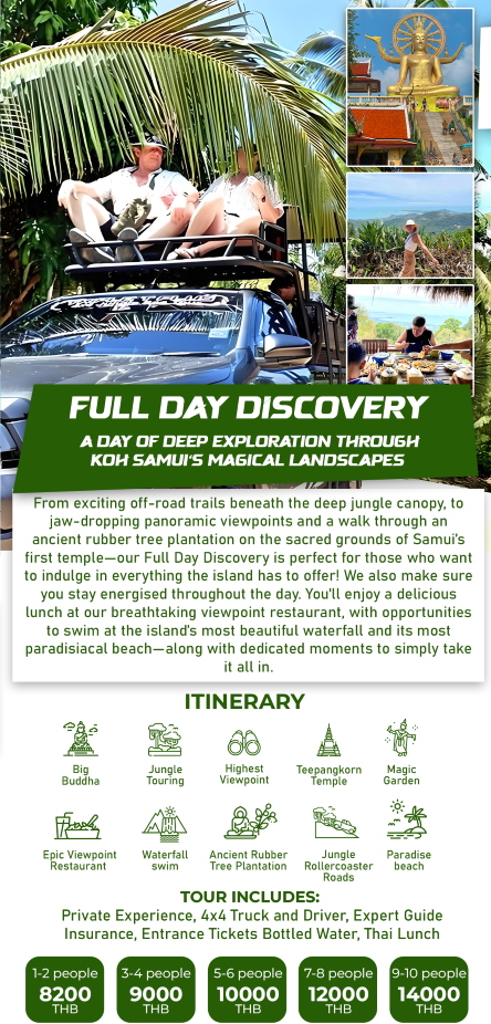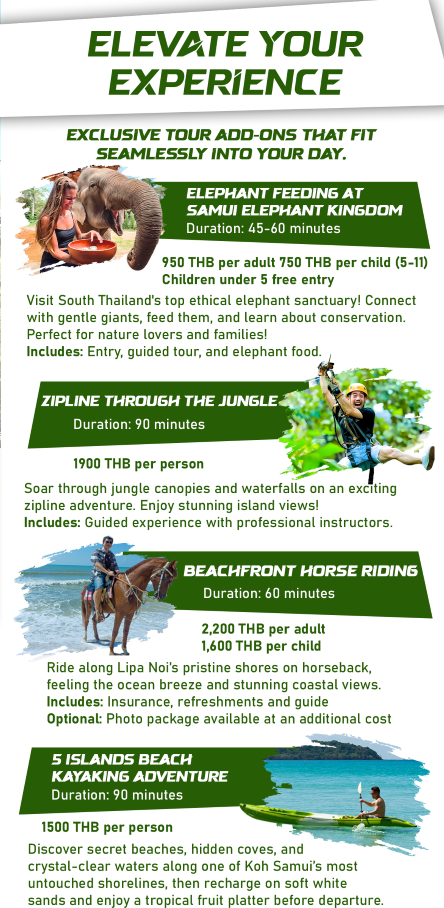 With handpicked add-ons that allow you to shape your safari around your sense of adventure, and expert guides who know every hidden trail, panoramic viewpoint, and untouched path, you’re not just taking a tour — you’re experiencing Koh Samui at its most unforgettable.